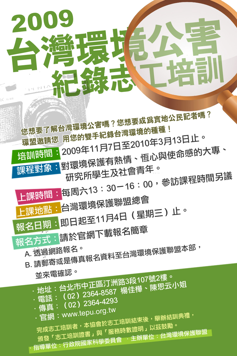課程對象:對環境保護有熱情、恆心與使命感的大專、研究所學生及社會青年。