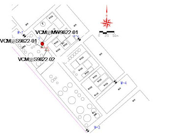 高雄市環保局科長馬振耀指出,環保署檢測發現地下水「1,2-二氯乙烷」超過管制標準30萬倍,那口檢測井設於台塑仁武廠的VCM廠(圖1),去年7月檢測。高雄縣環保局去年12月又增加數個監測點,發現地下水「1,2-二氯乙烷」最高超過2.06倍那口井,是在HCFC廠(圖2)。