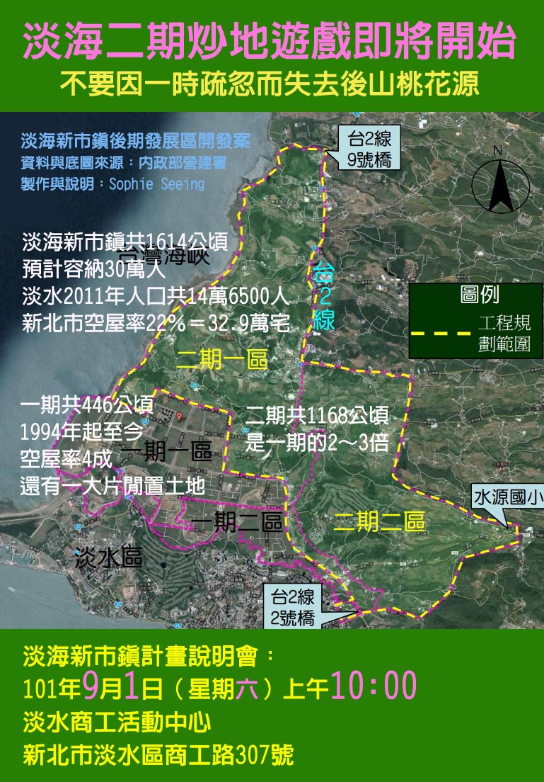 「淡海新市鎮」第一期自從1994年計畫開發至今,徵收走446公頃的土地,將原本可耕作的土壤挖走,然後倒進廢棄土,再打地基蓋樓房,向銀行融資借貸, 一魚四吃,卻又留下4成空屋,也還有一大片閒置土地;現在政府卻又急著徵收635公頃的淡海二期一區的土地,故技重施,接著又要留下多少空屋?多少已經不 能再耕作的閒置土地?接下來還有二期二區,兩區加起來一共1168公頃,是淡海一期的2~3倍土地,這些原本是可耕作的沃土,卻要葬送在絲毫找不到必要性 與公益性的開發計畫之下,我們到底還有多少資源可以這樣浪費?