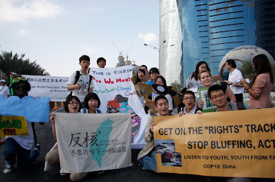 台灣青年氣候代表團與幾位研究生們,也參加了這次遊行。聽說今年參與遊行的主題是生物多樣性──好啦,看得出來是殺人鯨。最夯最能代表台灣環境公民意識的反核旗,當然也要來卡達亮相,對吧。