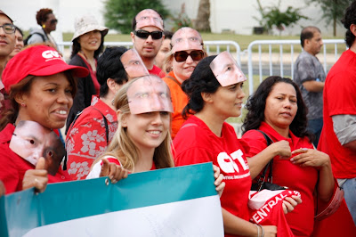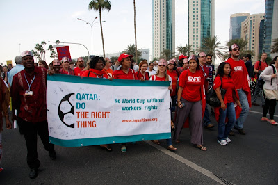 接著又是讓我很感動的一幕。這個團體為卡達的外籍移工爭取勞動人權,頭上的面具則代表所有無名的移工們。卡達有為數眾多的外籍移工從事建築、清潔與服務工作,然而他們勞動條件很差,居住環境又糟糕,無法組織工會,許多工作甚至有人身危險。近年卡達大量建設,加上2022年世界盃足球賽的場館建設,卡達召睞了更多外籍勞動者投入營建工作,大量的外國建築工人湧入將使得勞動人權更加惡化,國際勞工組織都已經關注這個議題。