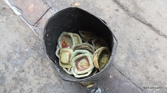 這些葉碗用在街頭小吃、祭拜儀式,因為成本相當低廉,所以目前仍然是印度街頭小販首選餐具,但是,就如同喝茶用的陶杯一樣,面對工廠大量製作壓低成本的塑膠餐具逐漸滲透。一邊是可以自然腐壞回歸大地再生的樹葉材質,一邊則是百年不爛堵塞環境的塑膠,當成本降低到相當接近、或是城市生活追求絕對衛生,那麼塑膠製品是否就會以虛偽潔淨之姿,正式從印度人手中擠下這些反樸歸真的綠色餐具。