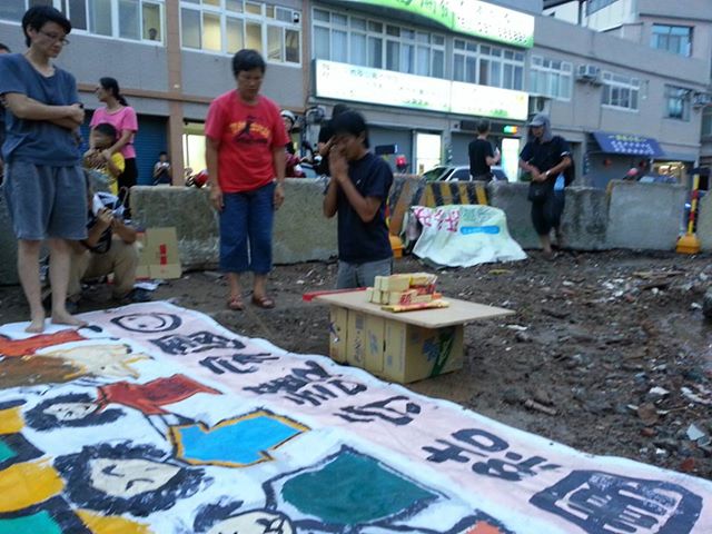 入夜的張藥房帳篷搭起來了,正前方的位置貼著「土地正義」。