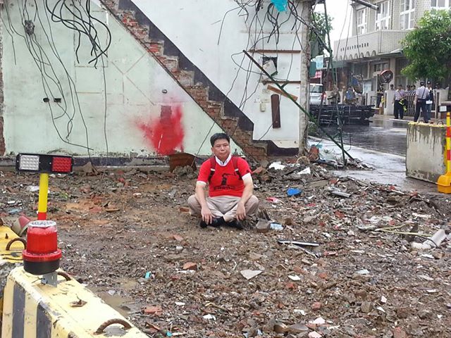 雨下更大了,政大地政系教授徐世榮從12點多來到現場,一直安靜站在一旁只是看著,沒有說什麼。看到下雨了、怪手走了、警察走了,突然彎下身從背包拿出紅色「農村出代誌」的T恤套上,快速穿過細雨一個劍步走向已拆除的張家,跨過護欄,從地上撿起兩個磚塊,就這樣坐在磚塊上。