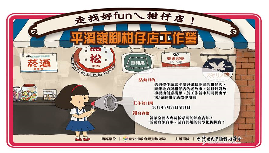 8/31(六)下午更將配合學生工作營成果辦理「走找好funㄟ柑仔店」導覽活動,邀請平溪導覽協會王肇經理事長帶領大家走平溪的舊街,找嶺腳的祕境,將柑仔店特色文化結合地方風情讓更多平溪線的訪客認識。導覽活動將不限學生參與,開放大眾報名,欲報名導覽活動的朋友們請至活動部落格funpingxi.blogspot.tw填寫報名表或傳真02-25558114。報名工作營的學生們亦請上活動部落格填寫簡章。