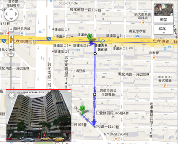 捷運忠孝敦化站4號出口-->迴轉進右側巷子(忠孝東路四段170巷)-->直走接安和路-->右側「安敦國際大樓」,大門在安和路上