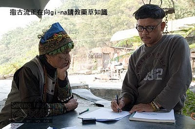 我去的那幾天,正好遇到有幾位同樣是台北來的年輕人,正在為撒古流的gi-na做紀錄片。「gi-na」就是母親的意思,她的歲數已大,平常喜歡穿著排灣族的傳統服飾,戴著一頂裡頭夾有草葉的小圓帽,有時是一圈又一圈的頭巾圍繞著。身軀瘦小的她,不太會說國語,也聽不太懂我們說什麼,她總是用排灣語與族人交談著,而我只能靜靜地看著她,閱讀她臉上的表情。聽撒古流說,gi-na懂很多山裡的藥草知識,以前部落族人生了病或受了傷,常常要來請教她,用什麼藥草治療最好,但是這些都沒有傳授下來,所以他正在為她做口述紀錄。gi-na也跟其他許多原住民婆婆一樣,很懂得傳統編織技術,也很會用曬乾的月桃葉做草蓆,秋月家中的地毯就是她編織的。紀錄片中的gi-na還很會唱歌,一首首聽似古老、悠遠的排灣傳統歌謠,從她口中向著大武山輕輕吐露,對岸的山嵐似乎凝結得更重了......
