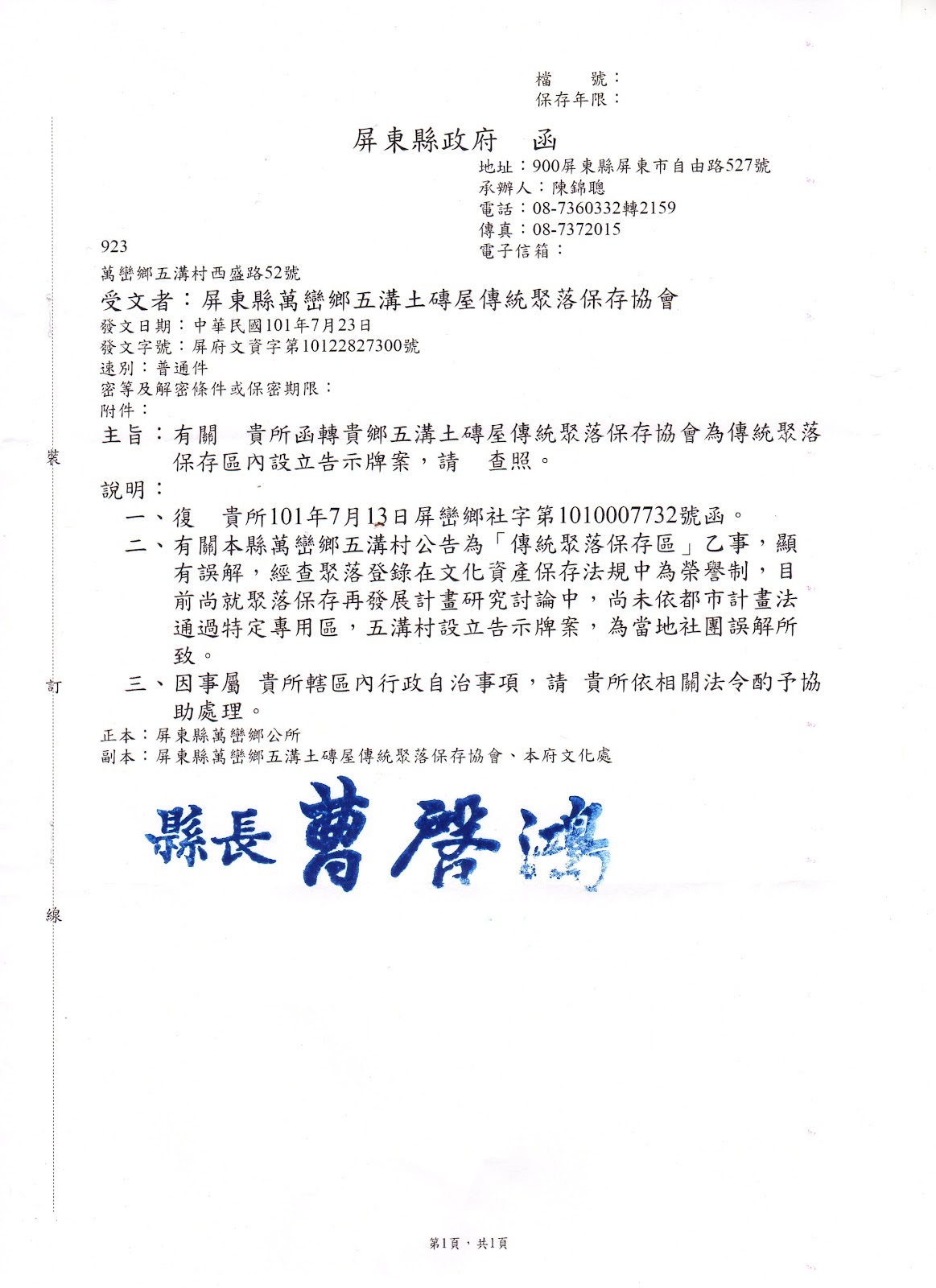 有關本縣萬巒鄉五溝村公告為「傳統聚落保存區」乙事,顯有誤解,經查聚落登錄在文化資產保存法規中為榮譽制,目前尚就聚落保存再發展計畫研究討論中,尚未依都市計畫法通過特定專用區,五溝村設立告示牌案,為當地社團誤解所致。(屏府文資字第10122827300號函)。