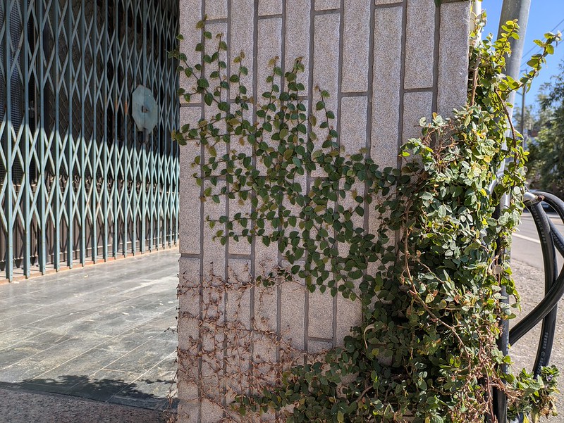 我是在花市認識薜荔(讀音同必力)的,但那時它叫做「霹靂」,種在小小的三吋盆裡,垂掛在牆上展售。或許因為它的本名常讓人念錯,店家才取了個響亮的綽號。不過,當我跟它變熟之後,發現它的風格確實挺「霹靂」:生命力強,能一路爬到天涯海角,無論是老屋磚牆、水泥河堤,還是三層樓高的樟樹,隨處都能見到薜荔的身影。 薜荔強大的攀附力來自莖部的不定根,它能輕巧地吸附在牆面,...