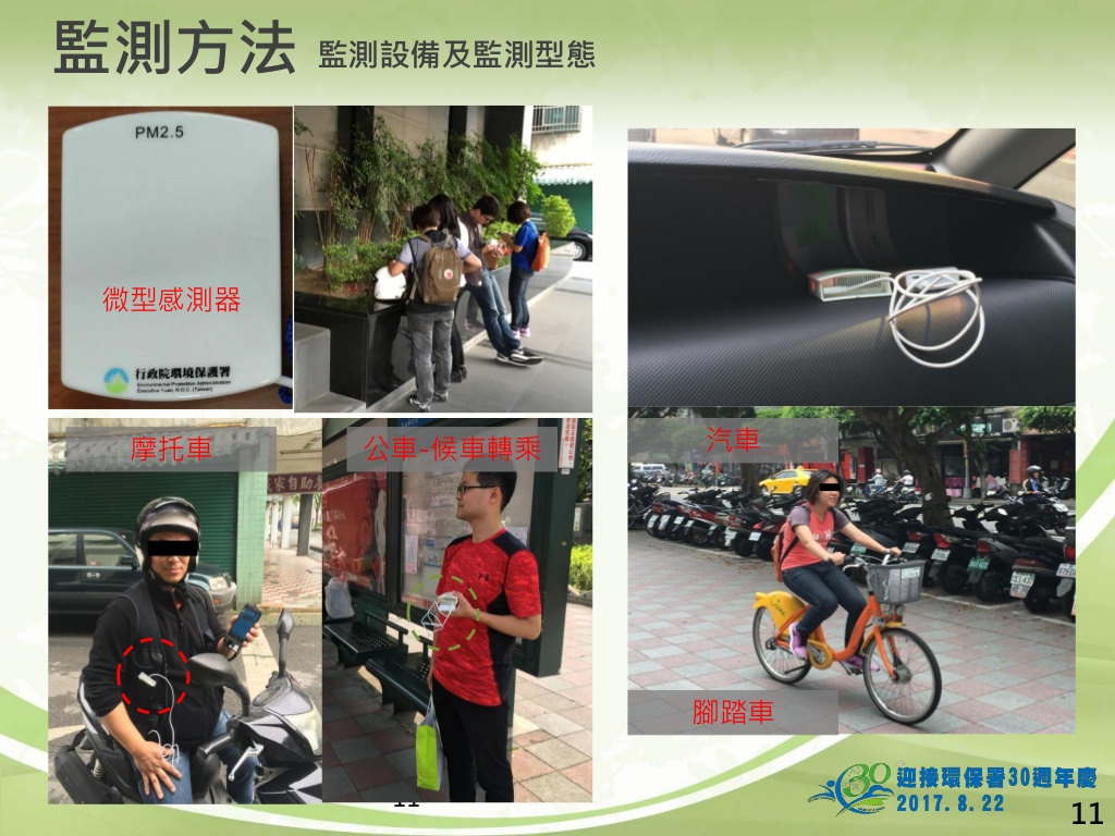 31日環保署空保處公布大台北都會區通勤期間空氣污染物暴露量的調查報告,搭乘不同交通工具通勤時,PM 2.5 暴露平均濃度分別為汽車7.6μg/m3、捷運21.9μg/m3、公車23.5μg/m3及摩托車32.1μg/m3。根據這個結果,環保署建議民眾多搭乘捷運系統及公車,才是保護自己也保護他人健康的選擇。 環保署於2017年的4、5月間,...