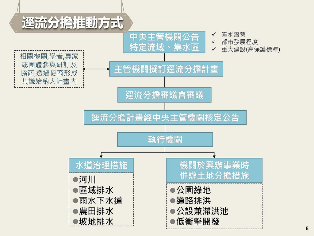 我國極端降雨越來越頻繁,但工程有其限度,為因應可能帶來的淹水災害,立法院29日三讀修正水利法部分條文,新增「逕流分擔與出流管制專章」,要求土地與建築開發者共同分擔滯洪、蓄水責任,以提高土地整體耐淹能力。 立委高志鵬22日主持召開「逕流分攤出流管制專章」的黨團朝野協商。他表示,近年來的洪災教訓清楚告訴國人,防災觀念與手段必須改變。 經濟部水利署指出,...