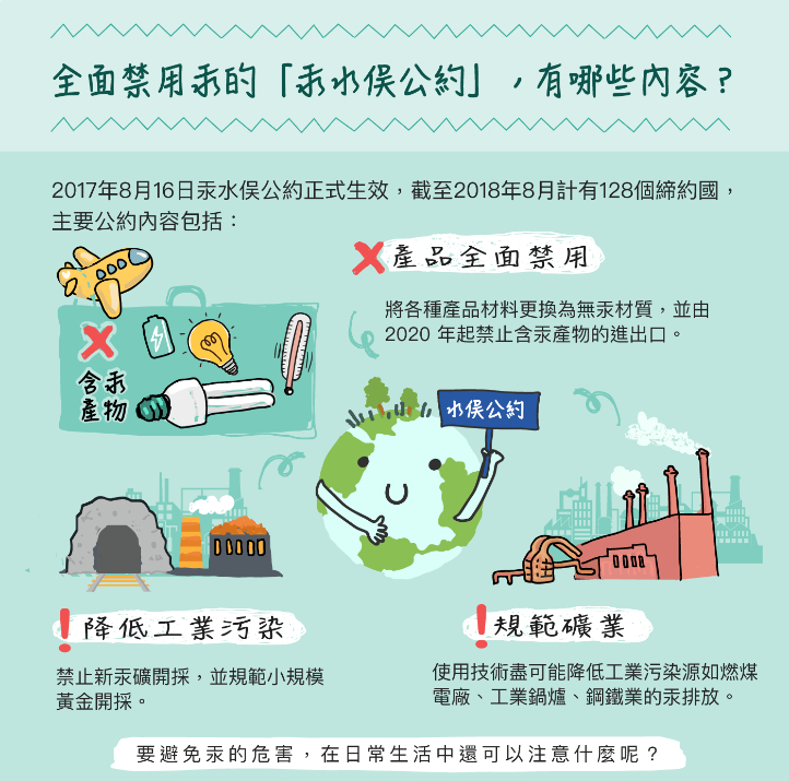 1956年,日本九州的水俣(音同雨)市爆發集體汞中毒的公害事件,上萬人出現四肢麻痺、步行困難、言語障礙等病徵,開啟了科學界對於汞健康危害的研究,進而促使聯合國於2013年締結 《汞水俣公約》 ,並於2017年8月16日生效,公約中要求締約國於2020年開始禁止開關及繼電器、水銀燈等含汞產品的生產、出口或進口。 台灣雖非聯合國成員,仍需接軌「逐步限汞、...
