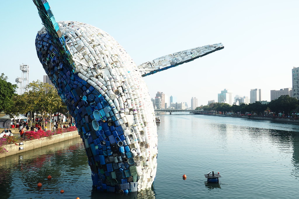 以15噸回收塑膠廢棄物組裝而成的大型鯨魚裝置藝術,1月下旬在高雄愛河亮相。名為「愛河.愛之鯨」的裝置藝術計畫,由新象活動推展中心發起,邀請美國建築設計團隊 StudioKCA創作設計,結合台灣鋼構技術並與高雄市環保局合作,將回收的塑膠垃圾打造成全台最大的水上裝置藝術。 巨大座頭鯨藍白色的形象從愛河水面躍起,配合愛河旁的高雄燈會,近日吸引許多民眾前往觀賞拍照...