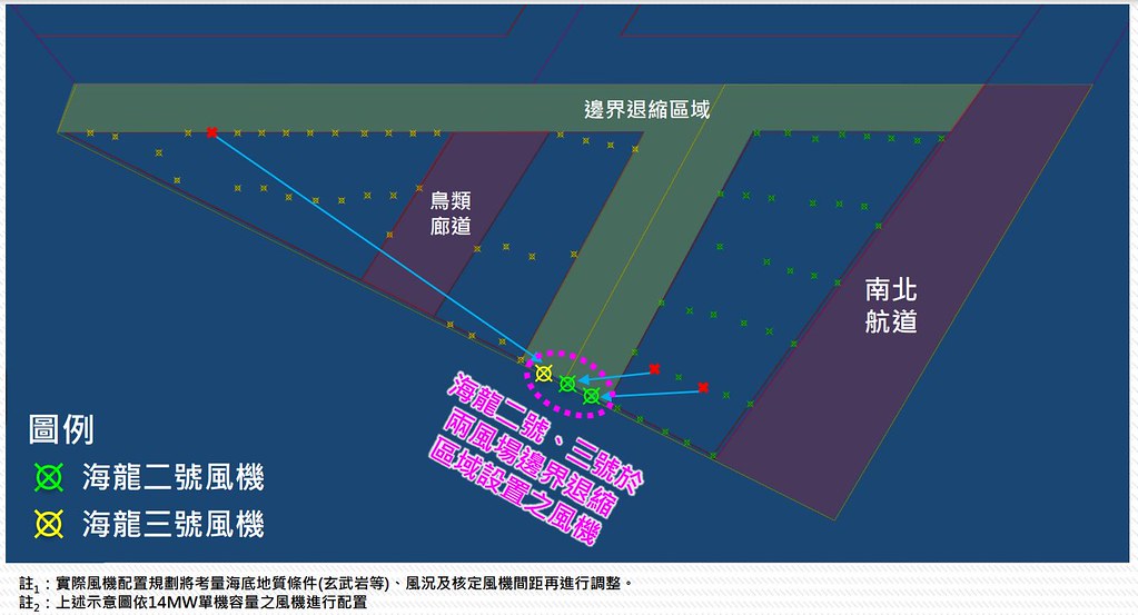 位在彰化外海的海龍二號、三號風場,因改採大風機而提出環境差異分析報告審查,卻因風機間距、風場邊界與鳥類廊道等問題,數度闖關環評失敗。最終由經濟部出手協調廠商,將3部風機挪至兩風場邊界退縮區域南端,封閉了可能成為「鳥類陷阱」的廊道入口,才解決了環評委員疑慮,於今(30)日順利通過環評。 海龍前次環評大會遭「保留再審」 經濟部允諾協調處理 海龍二、...