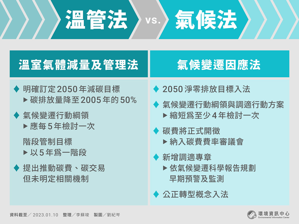 立院今(10)日三讀通過《溫室氣體減量及管理法》(溫管法)修正為《氣候變遷因應法》,確立2050淨零排放等氣候治理原則。在野黨及民間環保團體對於未能入法的碳稅機制、短中期目標等內容表示遺憾,環保署則強調,後續將積極展開溝通,目標在半年內提出碳費等相關子法。 時隔8年 淨零目標終於入法 響應聯合國氣候變化綱要公約(UNFCCC)精神,台灣於2015年公布施行...