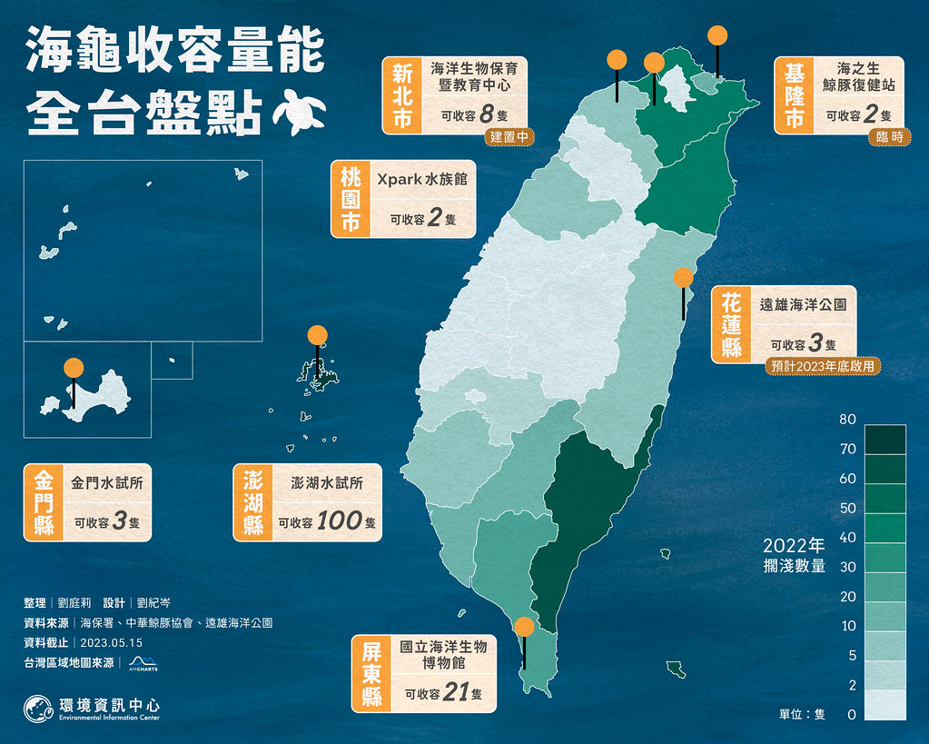 發現擱淺海龜,通報專線118之後呢?若是有醫療需求的海龜,全台有哪些地方可以收容?目前全台五座鯨豚與海龜救傷站、90個收容池的量能,足夠作為接住受傷海龜的「海龜急診室」嗎? 目前全台七成收容池集中於澎湖水試所,本島則有八成位於屏東海生館。今(2023)年北部主要救傷機構、台灣海洋大學海洋生態暨保育研究室(海大海龜研究室)宣布不收受傷海龜後,...