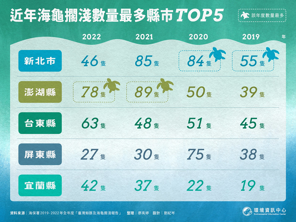 綠蠵龜是台灣附近海域最常見的海龜,保育等級列入國際自然保育聯盟(IUCN)瀕危物種紅皮書中。一隻綠蠵龜從幼年長到成熟可以繁衍下一代,至少需要20至50年的時間,但生活在充斥海岸開發、非法採捕、海洋垃圾的大海中,死亡卻只在一瞬間。 據統計,我國在2016至2018年的全年擱淺海龜數量分別為192隻、210隻、172隻。自2019年開始突破新高,來到269隻。...