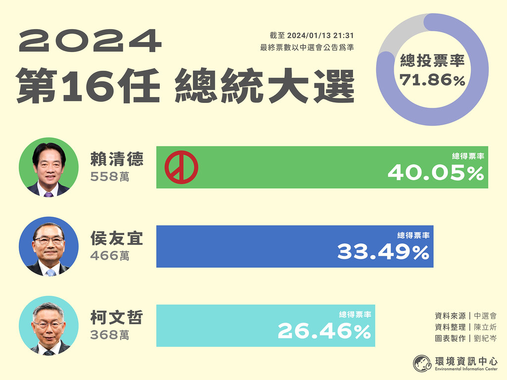 2024 年 01 月 15 日 2024總統大選民進黨三連執政 賴清德的環保議題和挑戰 13日晚間,中華民國第16任總統、副總統選舉結果出爐,民進黨賴清德、蕭美琴以5,586,019票(得票率40.05%)當選,民進黨連續三屆執政,打破同一政黨執政不超過八年的慣性,刷出台灣民主化以來的新紀錄。 賴清德獲四成票當選 「不會轉向也不會走回頭路」 2024年總統大選,有1404.8萬人投票,整體投票率為71.9%。今屆選戰,沒有一位候選人獲逾半選票... » 閱讀全文 藍綠白國會皆未過半 小黨全軍覆沒 環境意見由誰發聲? 2024年總統立委選舉順利落幕,雖然民進黨候選人賴清德高票當選,但國會情勢卻與蔡政府的全面執政截然不同。本屆立委選舉民進黨只取得51席、民眾黨8席,國民黨共有52席,成為國會最大黨,三黨席次皆未過半的情況下,各陣營如何取得共識將大幅度影響法案推動進展。除此之外,三黨以外的小黨全數落敗,也讓民間擔憂少數意見的表達空間受到縮限。 國會三黨不過半... » 閱讀全文 挑戰膠囊咖啡最大的痛 無殼「咖啡球」如何兼顧快速、風味、零廢棄 今天喝咖啡了嗎?一個小小的膠囊放入咖啡機,按下按鈕,就能享有一杯熱騰騰的香醇咖啡。方便、快速、無須技巧,膠囊咖啡市場快速成長,但膠囊的廢棄處理始終是個痛。 看準消費者關注環境的心,瑞士零售業巨頭Migros在2022年推出全球首款「無膠囊」的咖啡球。結合了風味、便利和零廢棄三大特點,號稱是「徹底翻轉咖啡業」的「史上最偉大創新產品」。 三個願望一次滿足... » 閱讀全文 綠島罕見鯨豚疑遭人切割 部分肉塊遺失海保署展開調查 海委會海保署8日接獲通報,有民眾在綠島柴口岸際發現罕見「銀杏齒中喙鯨」屍體,疑似遭人切割,現場還找到了放置肉塊的飼料袋,但仍有部分肉塊不見蹤影。海保署目前已會同台東縣農業處,及其他相關單位展開調查,希望知情民眾能提供情報。 海洋委員會海洋保育署昨(11)日透過新聞稿表示,本週一(8日)接獲民眾通報,在綠島的柴口岸際發現鯨豚屍體,海保署隔日上午會同海保救援網... » 閱讀全文 苗栗今年第二起石虎遭路殺、WMO示警聖嬰現象恐使2024年更熱、美中氣候特使先後請辭 近期活動 × 行動參與 近期活動 01/17 【台南社大】我們,在環境現場:林仲斌檢察官的環境案件簿 01/22 【綠色公民行動聯盟】《原子能世紀事件簿》放映暨映會座談 01/23 【自然步道協會】玩出蜂采 親子冬令營 01/24 【環團與總統有約】新書發表會 01/27 【內政部國家公園署】2024濕地日:送給下一代的濕地綠寶盒 01/29 【台灣仿生科技發展協會】2024台灣仿生設計競賽(高中職組) » 活動訊息託播 推薦讀者回應|讓P-22自由 一隻美洲獅如何促成全球最大野生動物廊道的誕生 林昰瑞:石虎保育好像也需要這樣。 » 閱讀全文