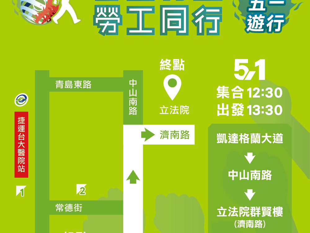 今年5月1日國際勞動節,台灣勞團按照往例走上街頭,以「連續執政無蜜月,國會修法挺勞權」為主調,呼籲即將邁入第三屆任期的民進黨政府以及新國會重視勞工權益,並提出許多修法建議。值得關注的是:在今年五一勞動遊行的隊伍中,除了工會團體之外,我們也可以看到環保團體作為發起團體走在隊伍之中,並喊出「公正轉型,勞工同行」的口號。除此之外,...