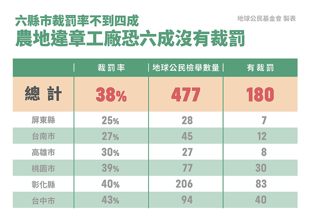 多年來農地違章工廠「不遷不拆」,地方政府則以經費及人力不足為由,執法效率甚低。地球公民基金會等環團於28日召開記者會,分析自2020年起民眾向各縣市府檢舉的農地違章工廠個案,指出桃園、台中等六縣市確認有被裁罰的個案共計不足四成。並指民眾檢舉還須自費購買地籍相關證明,以及縣府執法會面對「人情關係的壓力」。呼籲要求當局加快裁罰、落實複查,...