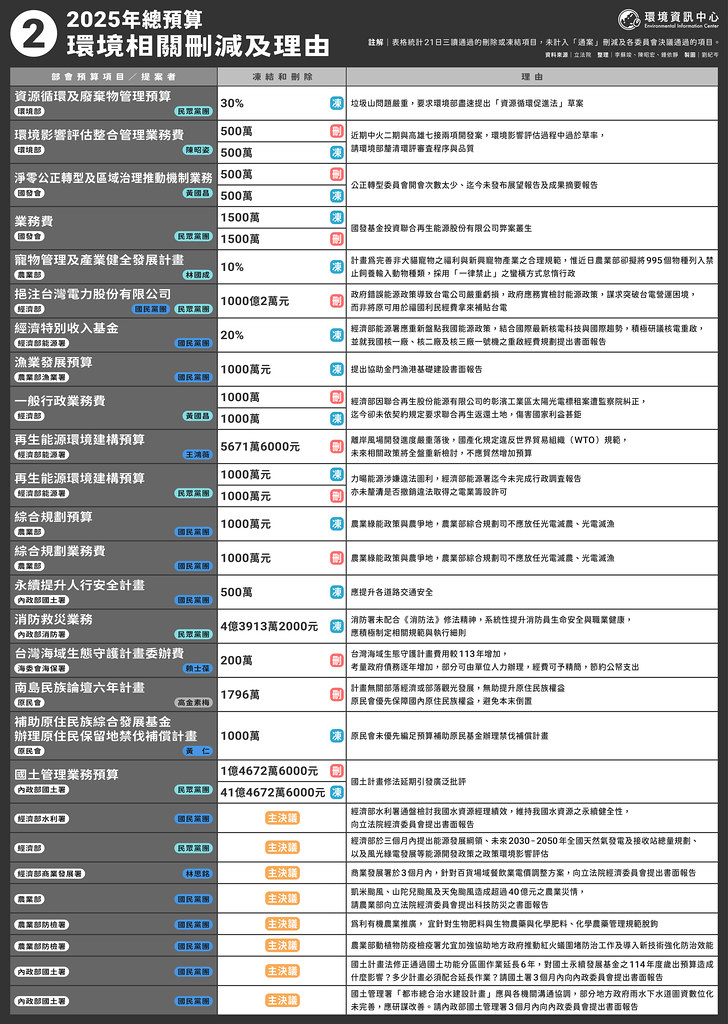立法院21日三讀通過中央政府總預算案,刪減2075億餘元成史上最多。環境與能源相關業務都大受影響。被刪除或凍結的項目之中,最大宗包含差旅費、業務費,以及媒體宣傳費等,幾乎全部單位都遭到通案刪減。卓揆表示,刪減數字至今無法核算,行政院將依法提出覆議。 史上最高刪減、凍結數 較前三年增6倍 刪減最多的部會是經濟部,刪減1037億元。經濟部長郭智輝昨(23)...
