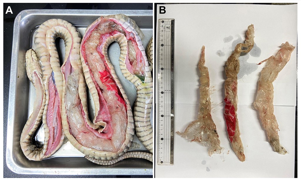 去(2024)年底,台灣研究團隊發表蛇類吞食塑膠袋後死亡的 論文報告 。論文作者之一、國立台灣師範大學生命科學系特聘教授林思民向《環境資訊中心》稱,2022年該系接獲一隻臭青公(又稱臭青母、王錦蛇),原本打算作體外寄生蟲研究之用,但無表傷的活體卻在運送途中死亡,解剖後發現牠生前吞掉三個塑膠袋,腸胃與「硬硬的東西」磨擦發炎甚至潰瘍,疑與死因相關。...