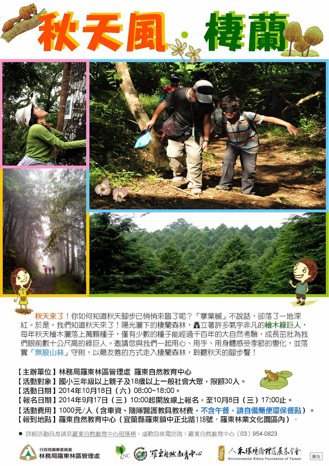 「秋天風‧棲蘭」活動將於10月18日(六)08:00~18:00舉行。歡迎國小三年級以上之親子及18歲以上一般大眾報名,每人費用1,000元。報名期間自9月17日(三)10:00起,額滿為止,名額上限30人。活動詳情請參考羅東自然教育中心部落格(http://luodong-nec.blogspot.tw)、羅東林區管理處網站(http://luodong.forest.gov.tw)及人禾環境倫理發展基金會網站(http://www.eeft.org.tw),或來電羅東自然教育中心(03)954-0823洽詢。