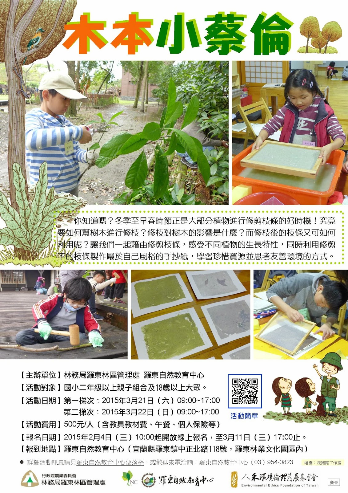 羅東自然教育中心將於3月21日(六)與3月22日(日)上午9:00至下午5:00辦理兩梯次的「木本小蔡倫」主題活動,讓我們一起藉由修剪枝葉,感受不同植物的生長特性,同時利用修剪下的枝條製作屬於自己風格的手抄紙,學習珍惜資源並思考友善環境的方式。
