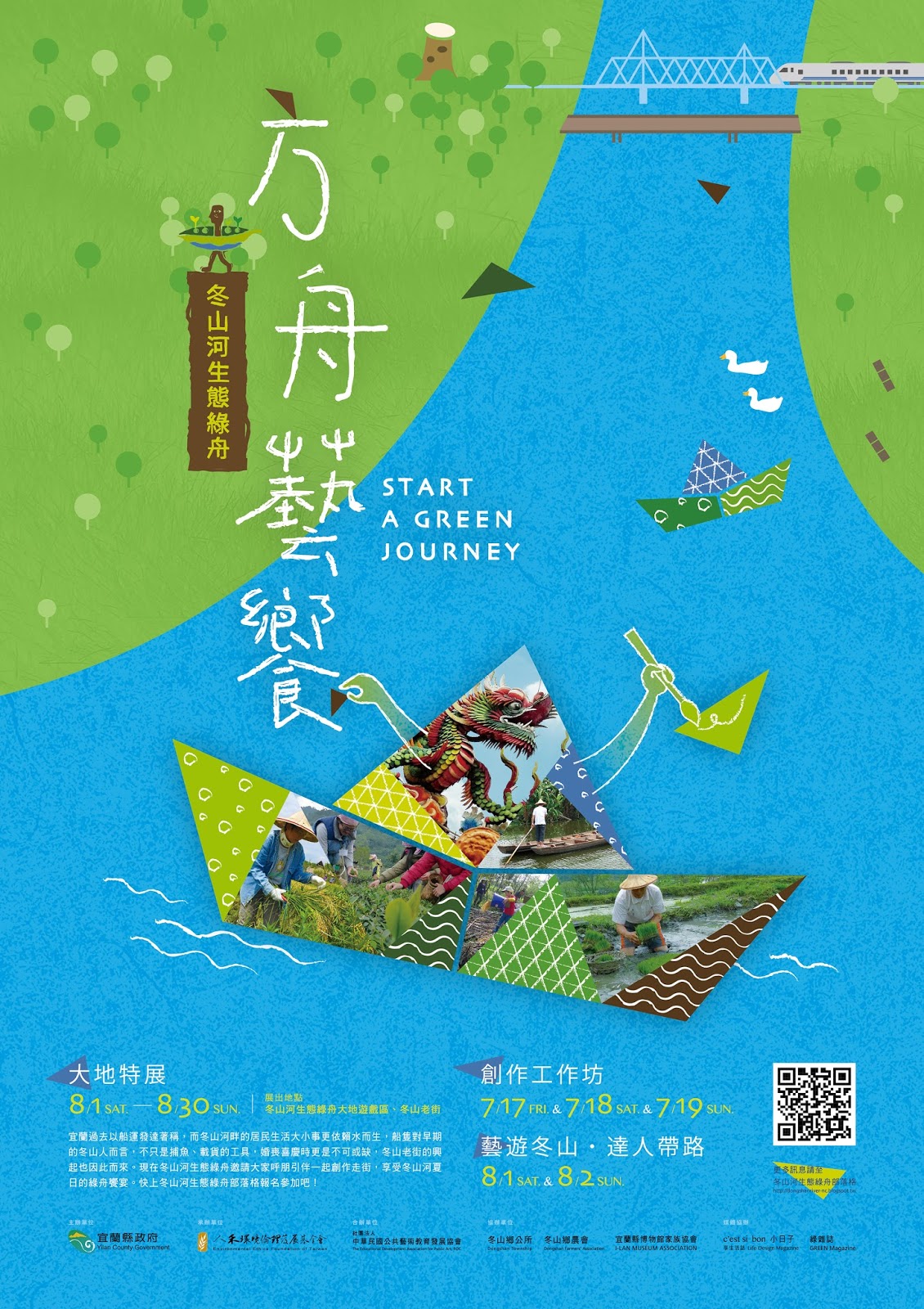 宜蘭為開啟台灣東部秀麗風光的第一扇門戶,從北台灣至此,經過長長幽閉的隧道,進入眼簾就是碧綠的田野風景,鷺鷥白晃的身影錯落其中,而流經宜蘭地區的蘭陽溪將這片平原一分為二,分支的溪流則成為豐沛土地的養分,其中最容易到達與親近的水域就是冬山河,今年還多了一個可以親近河流、土地和自然的新熱點「冬山河生態綠舟」。現在邀請大家進入生態綠舟,集體創作,打造充滿宜蘭特色的冬山河生態綠舟,遊藝行腳紀錄下精彩的時刻。