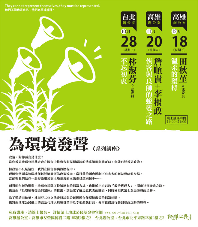 【為環境發聲】系列講座的推出,讓民眾了解民意代表的職責,同時檢視代議士為民發聲的足跡。除了邀請田秋堇、林淑芬二位立法委員談與民間組織合作環境政策的倡議經驗,也將由地球公民推出的政治代理人詹順貴董事及李根政執行長分享從倡議行動到參政之路的歷程。
