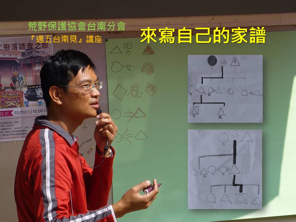 就在11/27週五晚上,請您帶一枝筆來,讓阿肇用自己的族譜經驗,帶著您試寫自己的家譜,並試著以這一份家譜為核心,不斷的往上、往下、往兩側擴大,用您自己的筆來寫自己的族譜;也一起來了解傳統漢人宗族複雜的親屬結構。