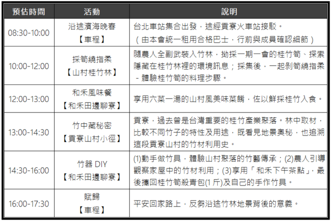 【活動費用】活動費用950元/人,「和禾生產班」和夥人享有攜伴1人各100元優惠。費用含:季節和禾風味餐、課程設計費、部分講師費、和禾下午茶點、桂竹筍殺青包(1斤) 、田野體驗及DIY材料、場地維護保育、行政管理成本及營業所得稅等,現場將開立發票。車資與部分講師費,由環保署計畫補助支應,請活動參加者妥善珍惜。