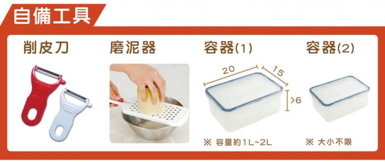 ※ 請自備削皮刀、磨泥器、容器*2 (附蓋子)、環保杯及餐具。
