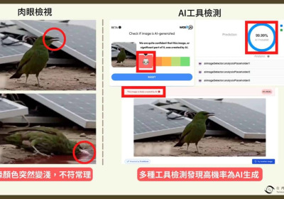 隨著人工智慧(AI)技術發展,網路上流傳著越來越多假影片。近日社群流傳一隻鳥喝了「光電紅水」暴斃的影片。事實查核中心指出,經查證此為AI製作之假影片。環境部今日發布新聞稿表示,已報請檢察機關追查來源,追究相關責任。