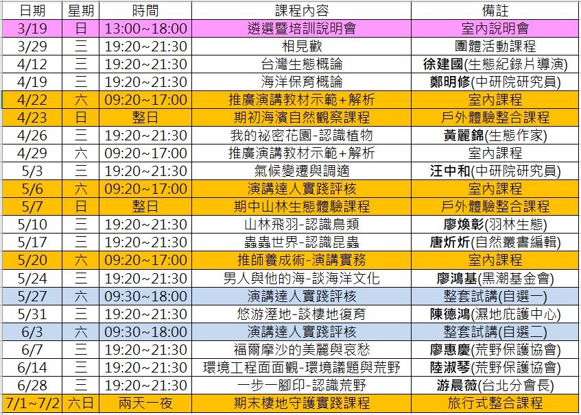 2.室內課程地點:荒野保護協會【荒野廳】台北市中正區詔安街204號B1/室外課程地點:課程中另行通知。