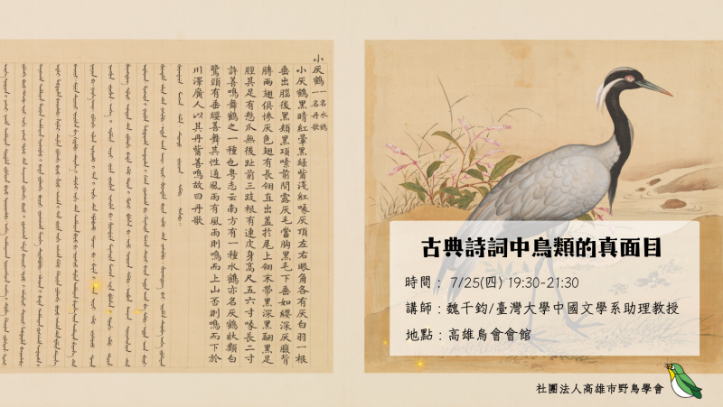 2024年07月15日 分享到Facebook 分享到Line 分享到Twitter 活動說明: 藉由古典詩詞中出現的鳥名,探究其中鳥類的真實面貌。包括古今鳥名所指涉鳥種是否存在差異,從中又流露出那些古人看待鳥類的想法。 時間:113/7/25(四) 19:00-21:00 地點:高雄鳥會 (高雄市前金區中華四路282號6樓) 報名方式:113/ 7月25日 11:59 截止 聯絡人:高雄鳥會/電話:07-2152525/E-mail:kwbs.bird@gmail.com 主辦單位:高雄市野鳥學會 活動網站:https://neti.cc/jxk7bO1 活動日期: 2024-07-25(週四)