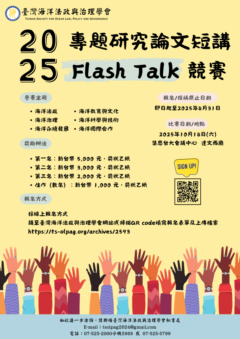 一、為鼓勵大專院校學生關注海洋議題,並促進學術社群對海洋治理、法政與永續發展等跨域主題之交流互動,本學會特舉辦專題研究論文短講(Flash Talk)競賽活動,提供青年學子一個發表研究構想與意見的平台。