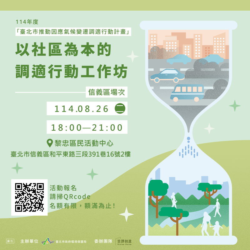 為因應氣候變遷,臺北市政府環境保護局規劃於各行政區辦理「以社區為本的調適行動工作坊」。本次信義場將邀集居民及關心氣候調適之民眾,分享在地觀察、討論潛在氣候風險,並凝聚可行之調適行動方向。