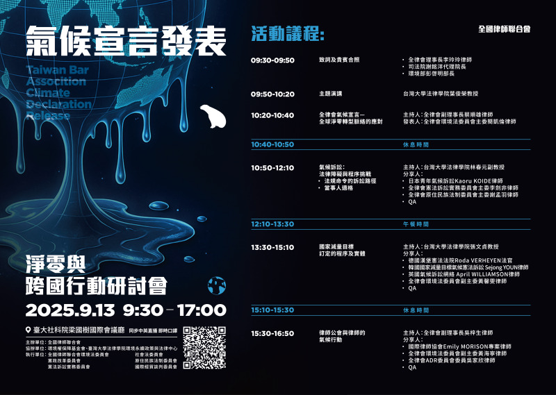 本場研討會除將正式對外發表氣候宣言外,亦將探討氣候倡議的法學議題,包含:氣候訴訟的法律障礙與程序挑戰、如何訂定國家減量目標,及律師(公會)的氣候行動中如何促成淨零轉型,並邀請德國Neubauer案、韓國減量目標憲法訴訟案、日本訴能源公司案等氣候訴訟案的承辦律師來共同參與討論,期待能透過本次研討會讓法律界更了解氣候議題,並促使法律人運用其法學專業和全體社會一同因應氣候危機。
