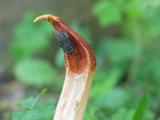 再靠近一點,發現頂端棕色的部份看起來濕濕黏黏的,會發出一種臭味,而且會吸引蒼蠅飛來在上面停留。我搜索枯腸,直覺想到「鬼筆」之類的蕈類。果然以「鬼筆」查詢比對,找到了「中華稜柱散尾鬼筆」。
