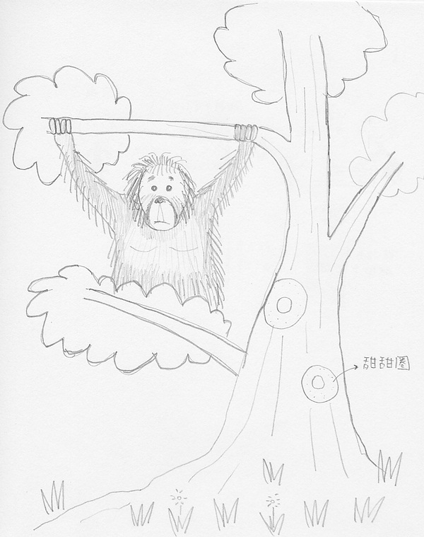 邊走邊玩的到達了「臨時指揮所」,凌拂老師已經等大夥一段時間了。老師帶著小朋友們觀察「戰鬥澡堂」旁那兩棵大榕樹,讓孩子們想像樹上會出現什麼樣的生物,如果他們可以住在樹上,那要住在樹的那個地方呢?大家天馬行空的說著,「我只想在樹下,我怕高!」、「我要到樹頂,那樣可以看的很遠」、「我要在那個分叉的地方,可以坐著,不會跌倒!」……最後,當所有小朋友坐在教室前的木棧板,看著之前曾被稱作「YA!YA!樹」的那棵鳳凰木時,有個小朋友忽然喊著,「樹上有猩猩!」,「哇!真的耶」,又是一陣騷動。一時我還無法會意,看了很久很久,直到換到和孩子一樣的高度向上看,「天啊!真的有一隻猩猩懸在枝條上耶!而且是一隻有頭有臉的紅毛猩猩耶!」