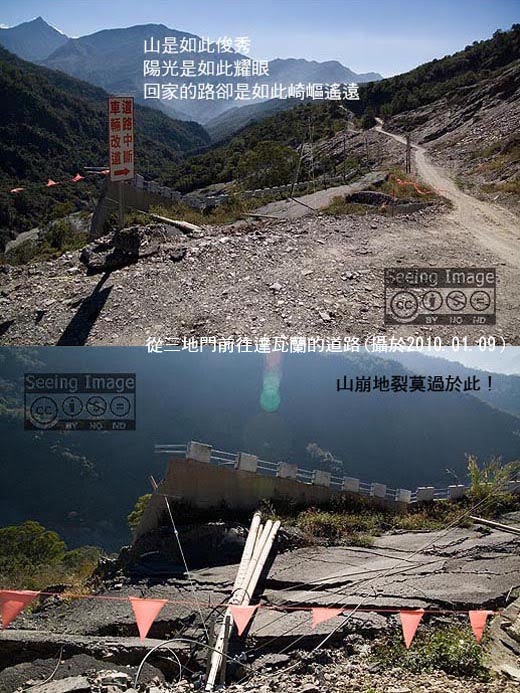 我坐上白村長那輛曾經載過無數村民進出部落的「噹貢」小貨車,她帶著些許歉疚和遺憾地說:「這輛車子很老了,我本來貸款買了一輛新的大車子,想說這樣載族人進出比較好用,結果沒想到貸款還沒還清,車子就被八八水災沖走了。」聽得我啞口無言,不知該安慰她至少命還在,還是該替她惋惜得繼續替一輛已經不在的新車付貸款。接著,車子過了檢查哨,然後進入德文村,這是另一座受災的排灣族部落,看起來似乎沒什麼大礙,還有居民在其中穿梭,白村長說:「他們有幾處的地基也不太穩了,是去是留還在討論中。」接著就看到一間掛在斷崖上的鐵皮屋子,我實在很驚訝,事情已經過了半年了,它居然還沒被處理掉,等著它自然掉落嗎?還是等著另一場災難的發生?