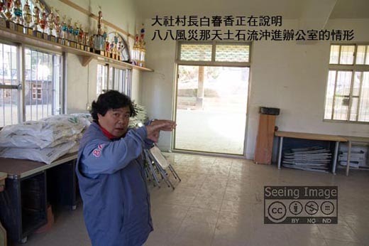 「我四點起床,看見雨水不斷從地裡冒出來,心想大事不妙,便找了鄰近幾個年輕人去查看溪溝,溪水已經沖壞了柏油路面,怎麼擋都擋不住了,便在五點緊急廣播,叫村民趕緊起床避難。到了七點半,路面水深已經及腰,電路已經全斷。我想到辦公室拿衛星電話求救,卻正好遇上土石流沖過來,我本來以為這下死定了,拼命往學校方向逃,像是與土石流賽跑一樣,所幸最後逃過一劫!」白村長在跟我說明此事時,因為我對大社的地理環境完全不瞭解,所以有點難以想像她所說的情況,後來聽說她隔天要回大社一趟,我決定跟她一道前往。