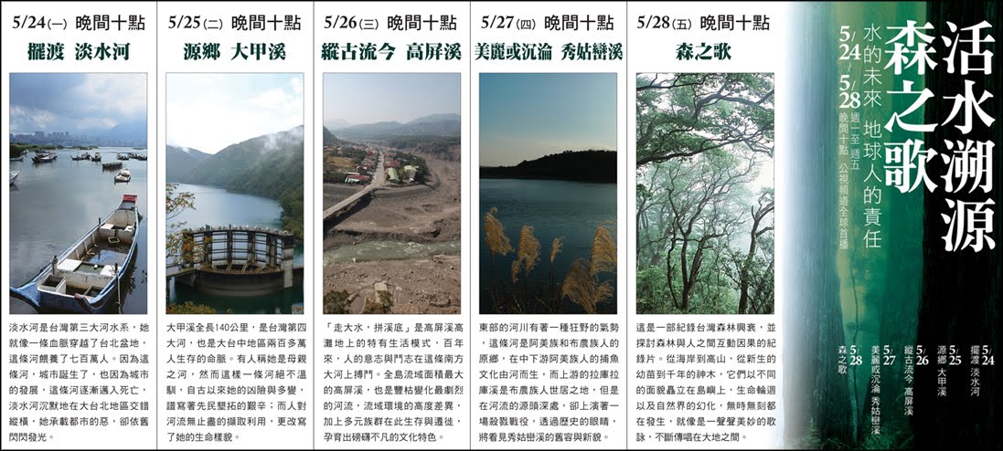 公視「活水溯源」及「森之歌」紀錄片,首度以HD高畫質,從河流發源地到出海口,溯源尋找第一滴水,完整紀錄台灣四大流域環境現況,以及台灣山百年變遷,傾聽台灣土地上最美麗的歌詠。
