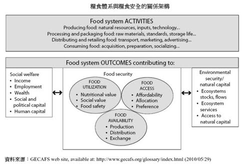 在說明上需要先行澄清的是,一直以來糧食安全的定義較為偏重在結果面,也就是強調如何擬定政策來解決或舒緩那些導致糧食不安全的因素,對於「過程」面的關注相對較少。2001年一個國際性及跨學科領域的研究團隊-全球環境變遷與糧食體系(Global Environmental Change and Food Systems, GECAFS)成立後,開始致力於地球生態環境與糧食體系兩者間關聯性的研究,將社會、經濟、政治與環境等過程性的因素(例如:飲食文化、市場條件、教育制度、土壤品質等)納入考量,凸顯出整個糧食體系中「過程」這項變數對於糧食安全的影響。FAO後來也受邀參與了GECAFS的研究與相關會議,共同提出「糧食不安全與易受害者資訊暨製圖系統」(Food Insecurity and Vulnerability Information and Mapping System, FIVIMS),將國際糧食供需鏈中多樣性的過程因素對於糧食安全的影響加以呈現。簡言之,過程性因素構成了糧食體系,而糧食體系運作的優劣決定了結果面層次的糧食安全與否。