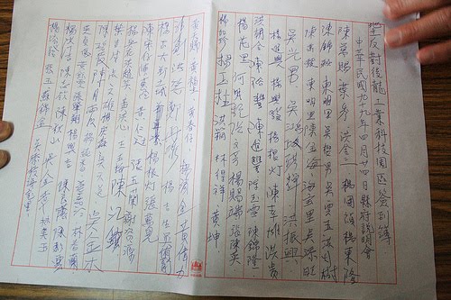 24號說明會當天,居民將簽到表分成兩份,一份是同意徵收者、一份是不同意的,她們自己架起簽到攤位,不讓縣政府把簽到表當成同意書,會議結束後,同意徵收者一個也沒有。會場裡多是雞皮鶴髮的長者,在空白日曆的背後,寫下鮮紅的抗議字句,她們清楚明白地論述這片土地所能帶給民眾的美好,不是布爾喬亞風味的農庄休閒,而是現實無比的:當工業受經濟風暴影響時,唯有這片土地養活張大的嘴。