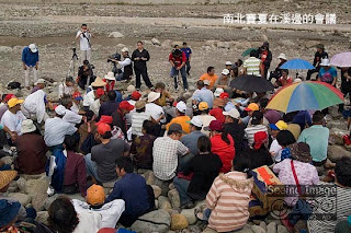 這天上午,我隨北賽夏一行人開車翻越兩賽夏族群的界山──鵝公髻山來到蓬萊村的中港溪邊,此時的溪邊已聚集許多人,包括南群與北群的族人,以及已經卡好位的諸多媒體、學者,大夥兒頂著不像11月天的大太陽圍坐在溪邊的大石上,聽完長達2個小時的輪流發言,族人大多以賽夏族語講完,到了為媒體朋友而說的「祭典交通管制」,才改為漢語發聲。