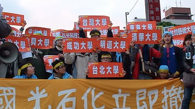 上千名學生從凱達格蘭大道來到環保署前,今晚他們要撤夜守在這裏。大鼓聲不時響起:「全國的青年們勇敢地站出來,為了我們的家園,不怕任何犧牲,反國光、救未來,我的同志們!為了我們的明天誓死戰鬥到底!」