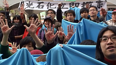 1月26日,來自台大、成大、台北大學、清大等20所大學、近千名學生,頭綁象徵大海的藍色頭巾,在環保署大門前冒雨守夜反對國光石化。
