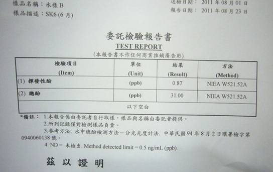 另外讓台南環盟覺得奇怪的是,那2家檢測公司一開始並未回報檢測出總酚 (ND,測不到),經聯盟說明送學術單位那份有測出總酚時,這2家檢測公司又表示「再看看結果」,甚至環團去拿報告時前後說法不一,當環團要求複測才要付費時,檢測公司不願意複測,連檢測費用都不來拿了。